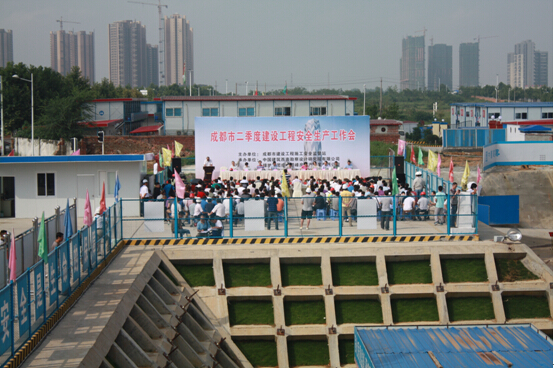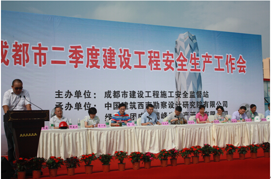 (市场部 岩土五公司)2014年7月16日上午,成都市第二季度建设工程安全生产工作会在成都绿地中心(东村)468超高层项目部召开。市安监站主要领导、院副总工程师、安办主任郑建兴及成都市在建基坑和市政项目的主要项目负责人、监理单位等200余人参加会议。